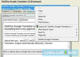 Oversæt øjeblikkeligt tekst i enhver applikation, der bruger Google Translate. Oversættelse vises i et pop op-vindue, så det er ikke nødvendigt at forlade den aktuelle applikation. Efter kopiering af teksten, der skal oversættes til udklipsholderen, kan ShaPlus Translator startes ved hjælp af en brugersæt genvejstast for at få oversættelsen. Understøtter 64 verdenssprog. Kan også integreres i kontekstmenuen i Interner Explorer. Dele af oversat tekst kan oversættes yderligere inden for selve ShaPlus Translator. Understøttede sprog: afrikaans, albansk, arabisk, aserbajdsjansk, baskisk, bengalsk, hviderussisk, bulgarsk, catalansk, kinesisk forenklet, kinesisk traditionel, kroatisk, tjekkisk, dansk, hollandsk, engelsk, esperanto, estisk, filippinsk, finsk, fransk, galicisk, georgisk , Tysk, græsk, gujarati, haitisk kreolsk, hebraisk, hindi, ungarsk, islandsk, indonesisk, irsk, italiensk, japansk, kannada, koreansk, latin, lettisk, litauisk, makedonsk, malaysisk, maltesisk, norsk, persisk, polsk, portugisisk, Rumænsk, Russisk, Serbisk, Slovakisk, Slovensk, Spansk, Swahili, Svensk, Tamil, Telugu, Thai, Tyrkisk, Ukrainsk, Urdu, Vietnamesisk, Walisisk og jiddisk.