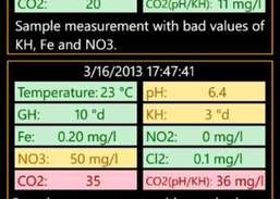 The application allows you to collect measurements of the chemical properties of the water in the Aquarium. The measured values are color-coded depending on if the measured value moves in an ideal, or an alarming warning zone. The value CO2(pH/KH) is derived from the measured pH and KH values according to Tillman's table.