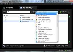 Easy Hot Key is a software that offers you the opportunity to put useful actions onto every key on your keyboard (of course, the f keys as well). That is for example "Open program/directory", "Open website" or "Insert text". Key combinations are also possible. A detailed list of all actions possible can be found below. Functions mostly used: Insert text; Open program/directory; Simulate key combination; Shut down windows. Possible functions: Adjust volume; Close all windows; Close program; Command line; Control audio/video playback; Control browser; Copy; Cut; Date and time; Display desktop; Display settings; Hide certain windows; Insert date/time; Insert text; Log off; New folder; Open browser; Open control panel; Open e-mail application; Open program/directory; Open website; Open website; Paste; Reboot windows; Regional and language settings; Search the internet; Show hidden windows; Shut down windows; Simulate key combination; Software list; Sound; Standby; System settings.