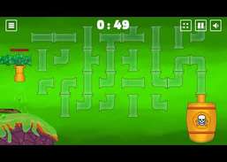 El juego tiene 20 niveles que difieren entre sí: niveles simples, que ayudarán a practicar la lógica del juego y cómo ensamblar correctamente la tubería. No hay restricciones en estos niveles, puede elegir la solución correcta por mucho tiempo; Por un tiempo: después de niveles de entrenamiento simples, complicamos la tarea, ahora cada nivel tiene un tiempo limitado, tenga cuidado al elegir la posición correcta de las tuberías, si se agota el tiempo, tendrá que comenzar el nivel nuevamente; Con una rotación de tubería limitada, ¿pudo hacer frente fácilmente a los niveles por un tiempo? Entonces complicaremos la tarea. Ahora, cada tubería se puede girar solo 4 veces, después de lo cual se romperá, tenga cuidado, porque hay tuberías sin las cuales no será posible establecer la ruta de tubería correcta. Piense de antemano antes de girar la tubería y mirar el tiempo; El filtro, y aquí están los nuevos niveles, ahora hay un filtro en el nivel que separa las toxinas en agua y veneno. Aquí debe extraer tuberías hacia el filtro, y desde el filtro debe conducir las tuberías en dos direcciones, limpiar el agua nuevamente hacia el árbol y recoger el veneno en un barril, simplemente no se olvide de la delimitación de giros y hora; Con diferentes direcciones, y finalmente, los niveles más difíciles. Aquí debe pensar detenidamente, ya que solo hay una opción para la tubería correcta, debe ejecutar el suministro de agua correctamente, pero en algún momento se dividirá en dos o incluso tres direcciones, lo que complica mucho la tarea. , no olvide el tiempo y las limitaciones de las vueltas de la tubería.