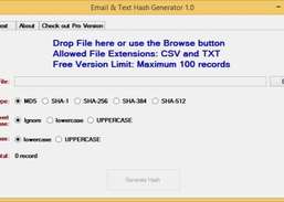 Generador de correo electrónico y texto Hash es una herramienta que convierte la lista de datos (por ejemplo, direcciones de correo electrónico, números de teléfono) de un TXT o CSV en uno de los algoritmos hash (MD5, SHA-1, SHA-256, SHA-384 o SHA -512). Además, también apoya la entrada de texto y genera un hash de forma automática. Los datos están seguros y no será transmitida a la Internet de terceros / as hash se realiza a nivel local de la PC .