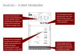 DeskCalc एक आसान-से-उपयोग वाला सामान्य-उद्देश्य डेस्कटॉप कैलकुलेटर है। इसकी प्रमुख विशेषता एक दृश्य गणना टेप है जो एक स्प्रेडशीट की तरह व्यवहार करता है, सभी गणनाओं की रिकॉर्डिंग करता है और पूर्व प्रविष्टियों को अपडेट करने की अनुमति देता है। इस टेप में माइक्रोसॉफ्ट एक्सेल के साथ एक-क्लिक एकीकरण है जो सरल गणना अनुक्रमों को मूल स्प्रेडशीट में विकसित करने की अनुमति देता है। सुविधाओं में प्रति स्थिति आरामदायक पाठ इनपुट के साथ एक चेक-स्ट्रिप, सुधार की संभावनाएं (मानों को सुधारना, जोड़ना और हटाना), अंतर्निहित सूत्र दुभाषिया, बिक्री कर कार्य, कैश (मेमोरी फ़ंक्शन), प्रतिशत गणना, यूरो-रूपांतरण, फ्लोटिंग पॉइंट- शामिल हैं। और निश्चित बिंदु-गणना, हज़ारों में उपखंड, तेज़ सुधार कुंजी, कार्य पट्टी और विंडो शीर्षक पंक्ति में परिणामों का प्रदर्शन, शीर्षक और दिनांक / समय, एक्सेल-निर्यात के साथ मुद्रण।