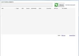画面の上部にワイヤレスアダプタのリストがあります。ワイヤレスアダプターリストの横にある[再スキャン]ボタンを確認できます。プログラムは毎秒自動的にスキャンします。そして、あなたは他に何もする必要はありません。ただし、問題が発生した場合は、ボタンを押してスキャン結果を更新してください。メインテーブルには、詳細なネットワーク情報が表示されます。次のパラメーターが表示されます:SSID、RSSI、BSSタイプ、MACアドレス、信号強度、暗号、認証方法、接続、およびセキュリティ。 PCにワイヤレスデバイスがない場合、プログラムは空のテーブルのみを表示します。
