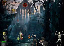 Ta med en Halloween-scene med animerte tegn: flaggermus, store mørke trær, gravstener og månen til skrivebordet ditt